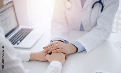 Doctor and patient sitting opposite each other at the table in clinic office. The focus is on female physician's hands reassuring woman, only hands, close up. Medicine concept