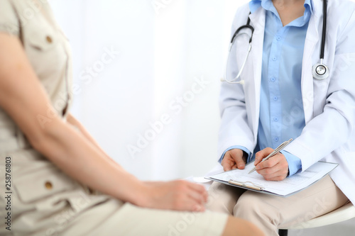 Doctor and patient talking. Physician at work in hospital while writing up medication history records form on clipboard near sitting woman. Healthcare and medicine concepts