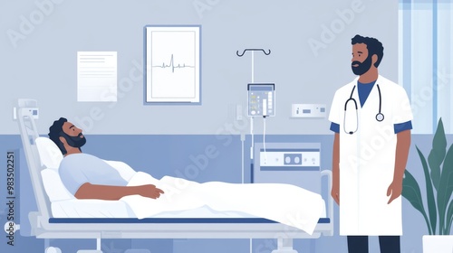 doctor, patient, hospital, room, bed, white, coat, stethoscope, man, medicals, health care, check-up, exam, care, disease, recovery, treatment, bedside, monitor, machine, equipment, chart, window, wall, blue, grey, light, shadow, standing, lying, hand, arm, beard, face, eye, black, brown, plant, green, pot, floor