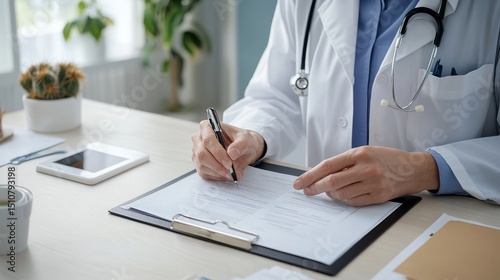 doctor, writing, medicals, form, health care, pen, clipboard, desk, medicine, health, patient, office, diagnosis, prescription, treatment, clinical, hospital, insurance, check-up, report, record, note, information, document, paperwork, contract, consultation, appointment, exam, analysis, stethoscope, uniform, professional, expertise, cognition, science, technology, cactus, tablet, mug, window, plant, indoor, light, table