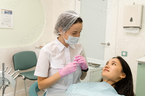 doctor dentist doing medical stomatology examination for woman patient, using professional tools