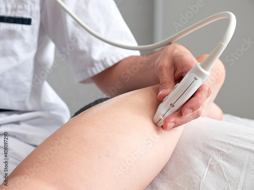 doctor doing an ultrasound to a woman's leg, no faces shown