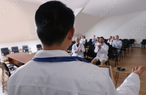 Doctor having discussion with audience in meeting room during medical conference, closeup