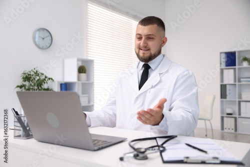 adult, background, call, care, caucasian, clinic, coat, communication, computer, consultation, device, diagnosis, digital, doctor, happy, having, health, health care, help, hospital, indoor, cyberspace, laptop, male, man, medicals, medicine, online, person, physician, professional, service, smiling, specialist, table, technology, healer, therapy, treatment, uniform, video, virtual, work, young