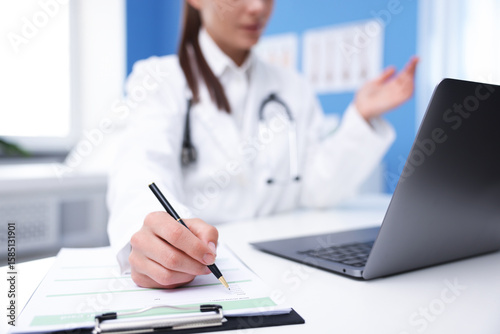 Doctor having online consultation via laptop in clinic, selective focus