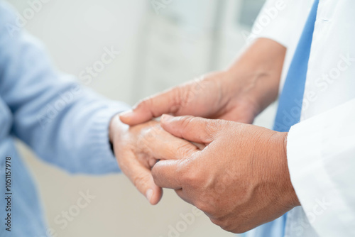 Doctor holding hands Asian elderly woman patient, help and care in hospital.