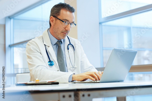doctor, health, health care, portrait, confident, man, middle-aged, grey hair, mature, working, laptop, tied-up, protocol, eyeglass, eyewear, professional, clinic, office, hospital, stethoscope, uniform, specialist, occupation, one person, indoor, surgeon, smart
