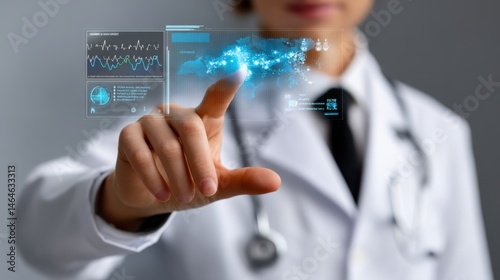 doctor, medicals, interface, futuristic, technology, health care, hologram, research, science, hand, touch screen, virtual, screen, display, datum, analysis, graph, chart, innovation, health, professional, laboratory, coat, stethoscope, man, male, digital, intelligence, smart, tech