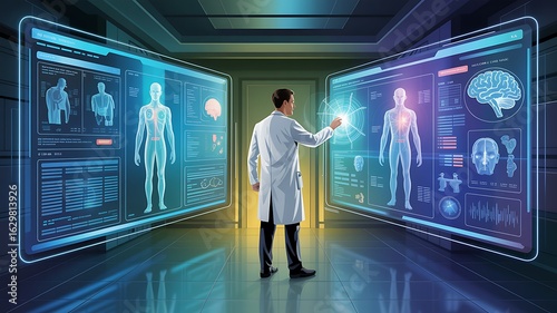 Doctor interacts with futuristic holographic medical displays showing human anatomy