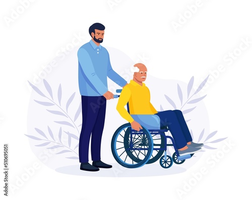 Doctor or nurse, relative pushing wheelchair with sick or disabled old man. Elderly person receiving help, care. Volunteer taking care about handicapped senior patient. Vector design