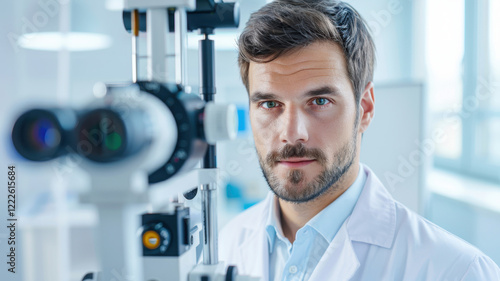 doctor, eye, exam, equipment, clinical, health care, male, focused, routine, vision, optometry, medicals, professional, bright, office, technology, optical, check-up, health, service, healthcare professional, diagnosis, treatment, medical equipment, eyecare, eyesight test, medical professional, eye doctor, medical practice, patient