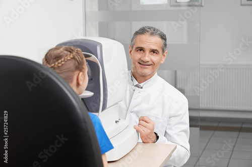 eye doctor, diagnosis, doctor, eyesight, patient, clinic, girl, children, professional, young, cute, pretty, beautiful, testing, experienced, examining, smiling, sitting, looking, white coat, eye doctor, medicine, medicals, optical store, hospital, laboratory, vision, correction, treatment, health care, optometry, wellness, 2, indoor, female, male, caucasian, people, horizontal, front view