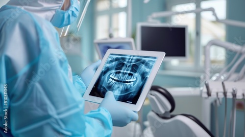 Doctor showing digital x-ray on tablet in dental office Explain dental treatment Wear protective clothing to prevent infection.