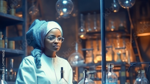 Doctor woman dark-skinned African American in her office and medical modern laboratory where people are undergoing examination of their health.