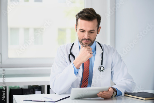 Doctor working at his office with digital tablet