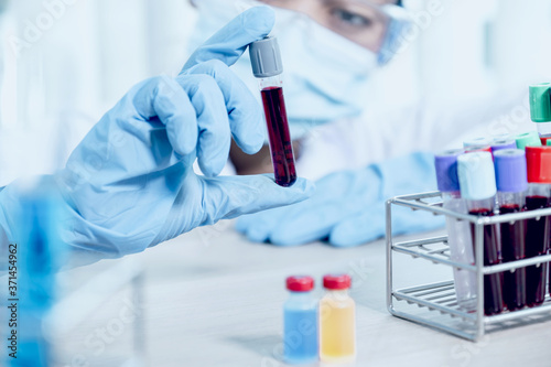 doctor's hand holding a sample blood tube for analysis and test virus disease in the laboratory, This research is plasma biomedicine for diagnostic medical healthcare