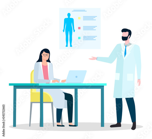 Doctors making researches and diagnosis of patient. Scientist woman working on computer. Male asking employer about results of test. Clinic or hospital medical services, vector in flat style
