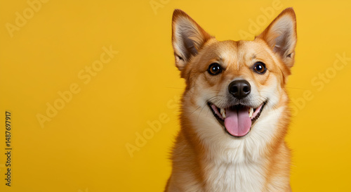 dog, puppy, canino, pet, animal, mammal, portrait, studio shot, yellow background, vibrant, cheerful, joyful, playful, cute, adorable, furry, fluffy, friendly, purebred, mixed breed, brown dog, copy space, banner, advertisement, graphic, design, illustration, wallpaper, screensaver, marketing, branding, website, blog