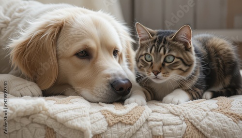 dog, cat, resting, lying, animal, pet, mammal, tabby, friendly, together, friendship, cosy, knitted, blanket, indoor, home, calm, peaceful, relaxing, domestic, cute, furry, closeup, portrait, looking, eye contact, white, beige, bed, pillow, domestic life, animal welfare, sweet