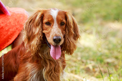 english, springer, spaniel, dog, animal, mammal, pet, doggy, sitting, breed, hunter, domestic, purebred, pedigree, portrait, thoroughbred, canino, brown, white, young, beautiful, cute, green, grass, nature, orange, park, adorable, companion, 1, happy, smile, background, closeup, meadow, summer, wool, fur, best, tongue, curly, spotted