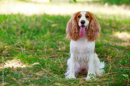 russian, hunting, spaniel, dog, breed, puppy, pet, animal, mammal, sitting, green, grass, pedigreed, thoroughbred, purebred, portrait, park, public, smile, tongue, 1, white, brown, domestic, canino, doggy, cute, curly, relaxation, background, closeup, companionship, beautiful, nature, looking, lovely, summer, adorable, wool, glade, meadow, field