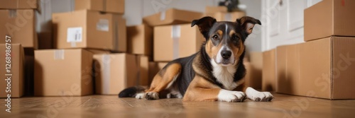Dog curled up among cardboard boxes on the floor, curl up, cardbord boxes