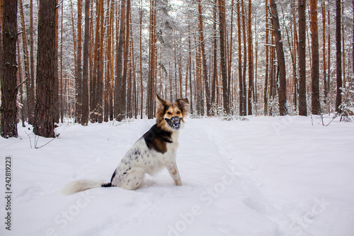 Dog in plastic muzzle running in winter forest with snow