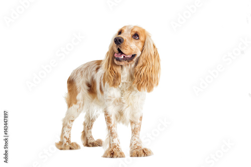 dog, white background, ginger, spotted, adult, looking, pet, animal, spaniel, cocker, white, background, domestic, animal, colours, isolated, portrait, young, beautiful, canino, purebred, mammal, brown, life, fur, 1, front, english, hair, puppy, sitting, hound, friendship, studio, eye