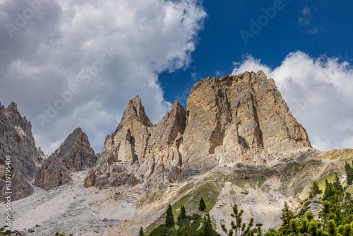 Dolomites mountains, Alpi Dolomiti beautiful scenic landscape in summer. Italian Alps mountain summits and rocky peaks above green valley alpine scene