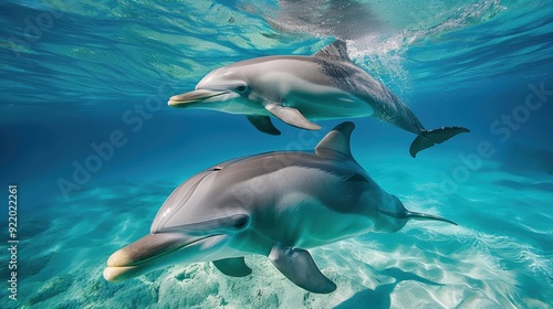 Dolphins swimming gracefully underwater, their sleek bodies gliding through the clear blue ocean. The sunlight filtering through the water enhances the beauty of this aquatic scene.