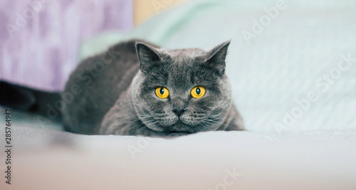 Domestic lovely cat. British shorthair cat with expressive orange eyes while laying on the bed in room.