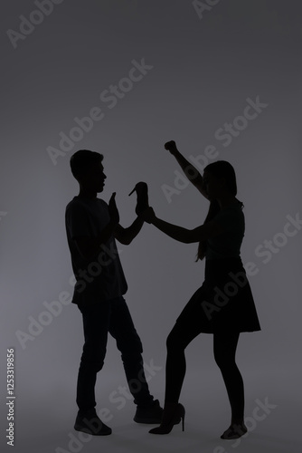 abuse, abusing, adult, aggressive, arguing, assault, attack, background, concept, couple, crime, criminal, danger, dark, domestic, emotional, family, fear, female, fight, fighting, full, grey, harassment, heeled, high, high-heeled, bruised, husband, length, male, man, people, physical, problem, quarrel, human relationships, shoe, silhouette, social, studio, threatening, unhappy, vertical, victim, violence, wife, woman