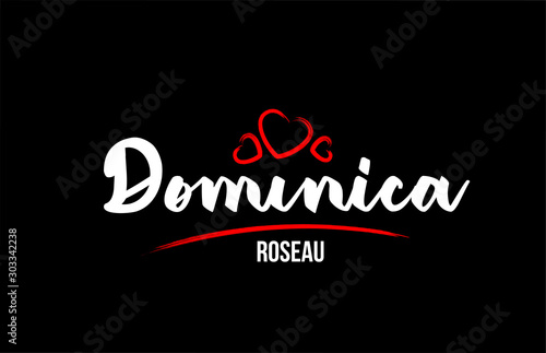 Dominica country on black background with red love heart and its capital Roseau