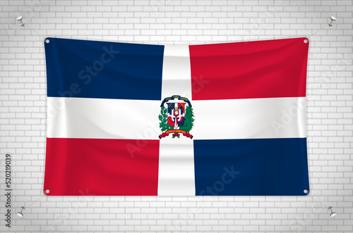 Dominican Republic flag hanging on brick wall. 3D drawing. Flag attached to the wall. Neatly drawing in groups on separate layers for easy editing.