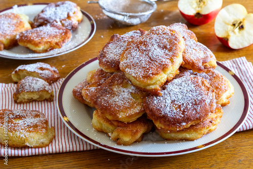 powdered sugar, apple, homemade, apple, sweet, fried, breakfast, food, dessert, dish, traditional, polish, sweet, snack, meal