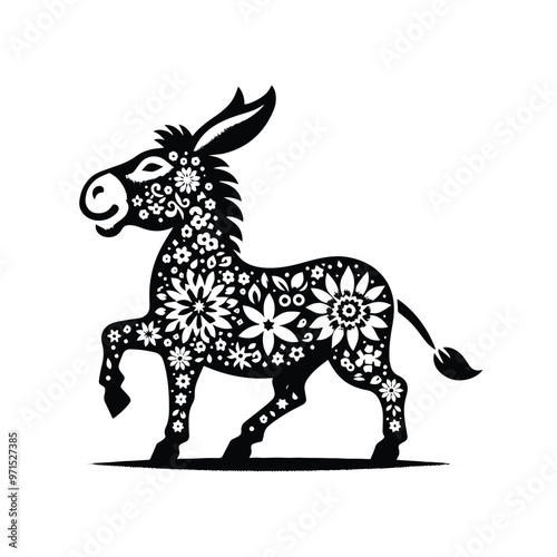Donkey in folk art black and white silhouette illustration