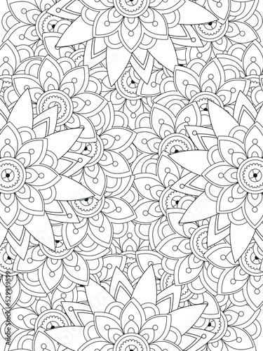 Doodle floral pattern in black and white. A page for coloring book: fascinating and relaxing job for children and adults. Zentangle drawing. Flower carpet in a magic garden