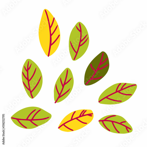 Doodle leaves set. Hand-drawn cute plant isolated on white background. Green leaf with pink veins. Herb summer sign. Vector floral illustration for interior, gardening, holiday. Eco botanical poster