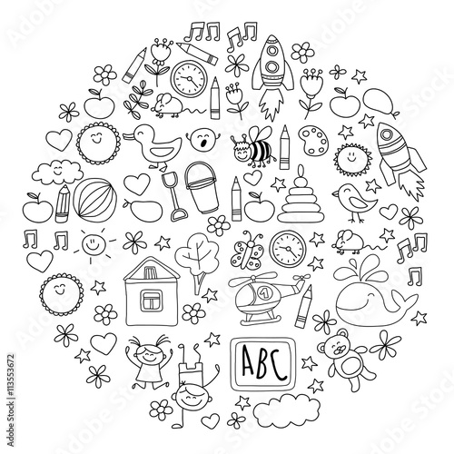 kindergarten, children, children, drawing, pen, wax crayons, crayons, illustration, education, nurse, toy, sun, clock, smile, helicopter, plane, whale, music, lesson, preschool, learning, apple, fruit, pear, duck, rocket, start, explore, flower, horse, jump, happy, vector, icon, doodle, set, background, web, poster, element, bucket, pattern, cloud, nubes, love, school