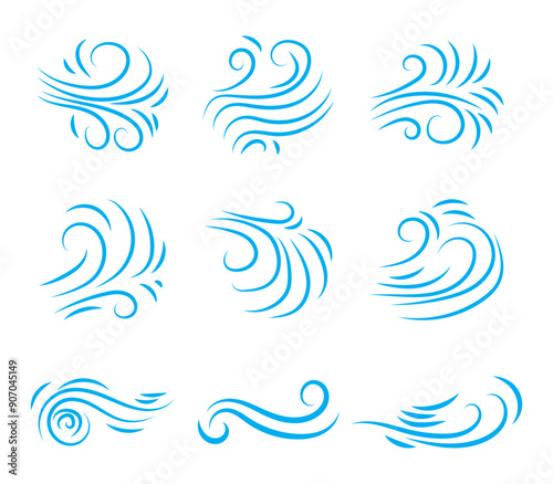 Doodle wind motion. Isolated vector set of abstract air swirls, blow waves, curve spirals in black colors, capturing the dynamic essence of movement and energy in a playful and artistic cartoon manner