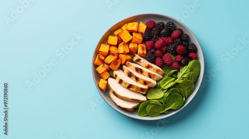 dinner, menu, grilled, turkey, spinach, dessert, berry, typography, modern, healthy, nourishment, colourful, epicure, culinary, vibrant, food, meal, plate, receipe, wholesome, favor, enjoyment, appetising