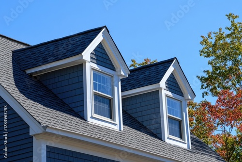 Dormer windows on the sloped shingle roof of a newly built house in Brighton, Massachusetts, USA