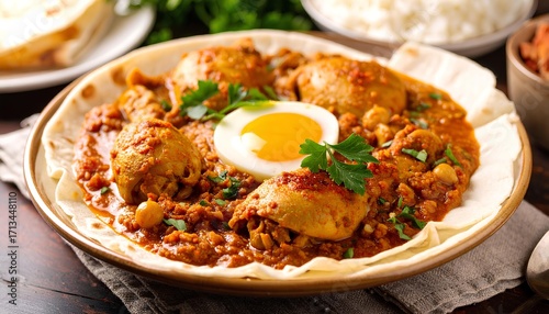Doro Wat spicy chicken stew with egg and injera on a plate