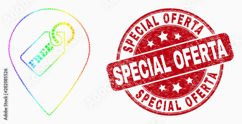 Dot bright spectral free tag marker mosaic icon and Special Oferta stamp. Red vector round textured stamp with Special Oferta title. Vector composition in flat style.