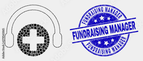 Dot medical assistance headphones mosaic icon and Fundraising Manager seal stamp. Blue vector round grunge seal stamp with Fundraising Manager caption. Vector collage in flat style.