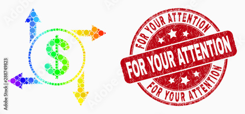 Dot spectral dollar emission mosaic pictogram and For Your Attention stamp. Red vector round textured seal stamp with For Your Attention caption. Vector collage in flat style.