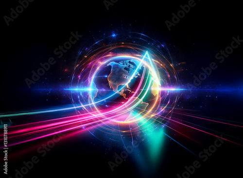 Double exposure effect: a glowing globe encircled by vibrant light trails, creating an abstract and futuristic design against a dark background.