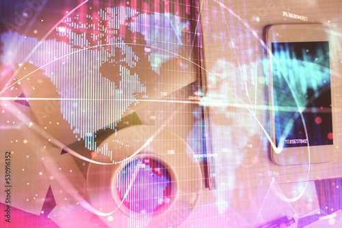 Double exposure of business theme hologram over desktop with phone. Top view. Mobile international trade connection concept.