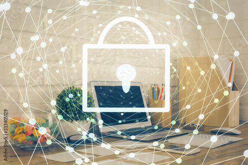 Double exposure of desktop with computer and lock icon hologram. Concept of data safety.