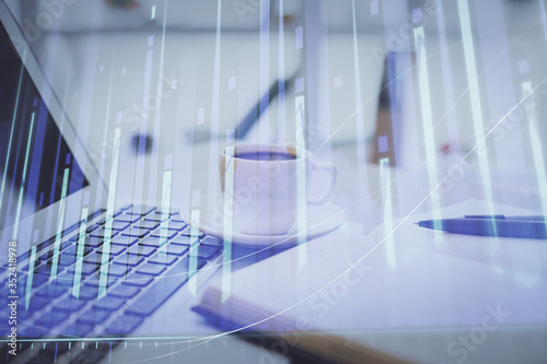Double exposure of financial chart drawing and desktop with coffee and items on table background. Concept of forex market trading